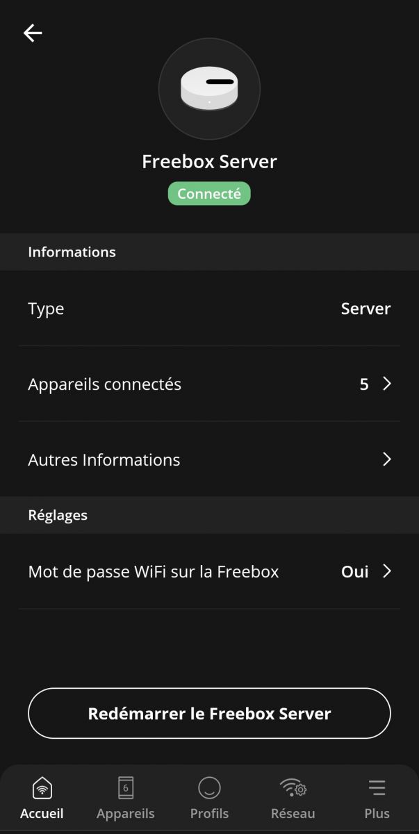 En cliquant sur l’un des équipement Free, vous pourrez déterminer à qui il est connecté et même le redémarrer facilement avec un bouton dédié