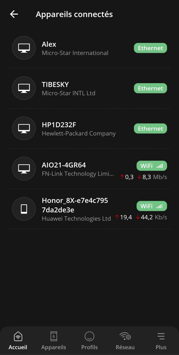 Au premier abord, l’application propose directement les informations nécessaires pour gérer le Wi-Fi : quels appareils sont connectés ? Chacun avec un logo, toujours dans cette optique de faciliter la prise en main. Une interface épurée pour s’y retrouver facilement donc. A noter que l’application s’adapte aux préférences de votre smartphone et peut ainsi afficher le mode sombre et le mode clair.