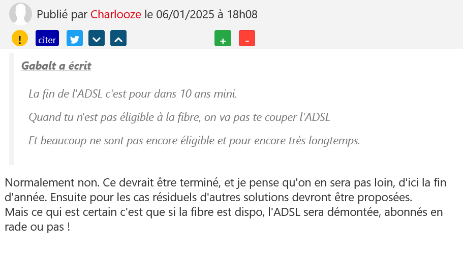Si la fermeture technique du réseau cuivre n’est pas remise en cause et devrait bien être effective en 2030, l’arrêt de commercialisation des offres ADSL subira quelques retards, au moins localement. Mais certains n’y croient pas trop et considèrent que de nombreux foyers se verront obligés de passer à une autre solution pour le THD.