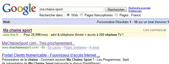 Cette annonce permet raisonnablement de penser que la chaîne pourrait être disponible également chez Free. Ceci est d’autant plus probable que Free a acheté les mots clefs « Ma chaîne sport » sur Google.