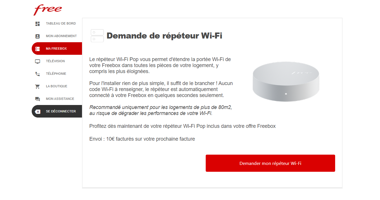 Pour cela, il suffit de se rendre dans l’onglet “Ma Freebox”, qui vous propose de commander un répéteur Wi-Fi avec un lien dédié.
