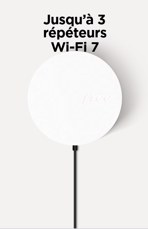 Il est par ailleurs possible d’y connecter jusqu’à 3 répéteurs WiFi 7. Grâce à la technologie Mesh intégrée, tous les appareils se connectent d’eux-mêmes à tout moment au meilleur point d’accès (Freebox Pro ou Répéteur Wi-Fi 7). Le Wi-Fi 7 suit ainsi le professionnel de manière fluide et automatique, d’un bureau à l’autre, sans interruption.