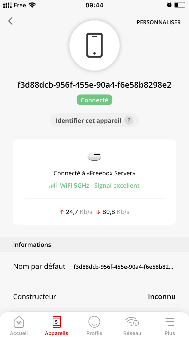 L’application Freebox Connect est la solution la plus simple pour gérer votre WiFi. Cliquez sur l’icône “Appareils” en bas de l’écran, entre “Accueil” et “Profils”. Vous verrez la liste des appareils connectés et non connectés. Des informations utiles sont disponibles comme la puissance du signal WiFi, détails supplémentaires comme l’adresse MAC, IPv4 et IPv6 ou encore la possibilité de changer le nom de l’appareil et de sélectionner son type (ordinateur, smartphone, tablette, imprimante, etc.). Il est aussi possible de connaître la date de la 1ère connexion des appareils, lesquels peuvent être classés comme identifiés ou non. Vous pouvez bloquer individuellement chaque appareil suspect.