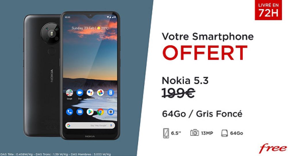 Ce forfait Free Veepee est proposé au tarif habituel, soit 19,99€/mois ou 15,99€/mois pour les abonnés Freebox, avec un engagement de 24 mois. En passant commande sur le site de e-commerce, vous recevrez gratuitement également un Nokia 5.3, 64 Go et coloris Gris foncé (d’une valeur de 199€). Il s’agit d’un smartphone encore jamais proposé par Free dans le cadre des offre sur Veepee. Un modèle d’entrée de gamme arrivée récemment dans la boutique en ligne de l’opérateur, proposant notamment un écran HD 6.5 pouces, une batterie de 4000 mAh et surtout, une compatibilité avec la bande 700MHz, chère à Free Mobile.