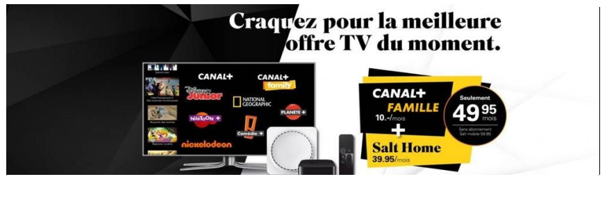 Lancée en juin, l’offre couplée Salt Home + Canal+ famille a connu un vrai engouement affirme Salt, car c’est une première en Suisse. Cette offre comprend 35 chaînes dont les chaînes Canal+ et Canal+ Family. Ces chaînes diffusent plus de 300 films inédits par an, 8 mois après leur sortie et plus de 20 nouvelles séries US & internationales par an. Retrouvez aussi des films et documentaires pour toute la famille. Sans oublier des chaîne jeunesse, découverte et divertissement comme Nickelodeon, National Geographic ou MTV .