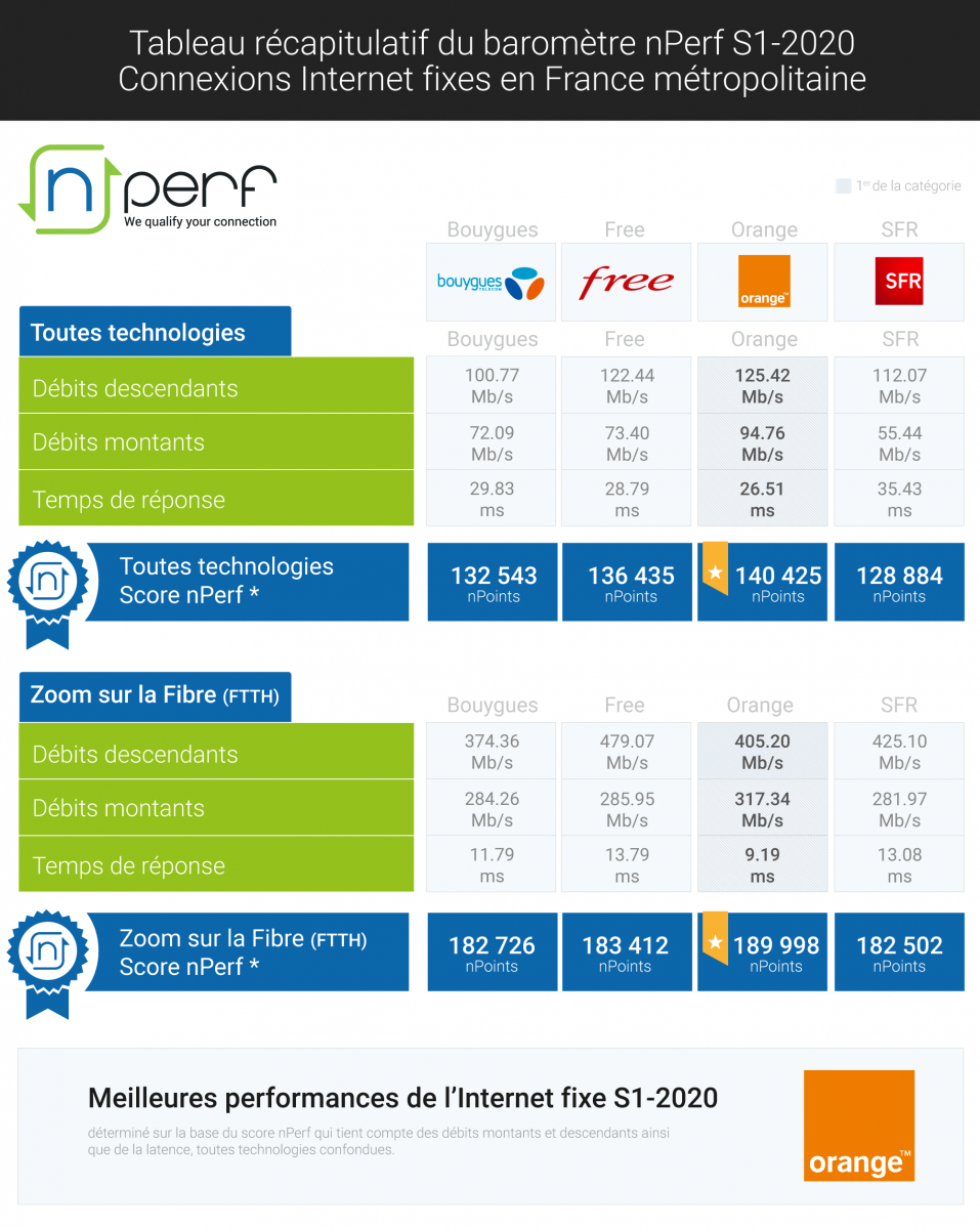 Cependant, Orange est meilleur en terme de débit montant moyen (317.34 Mb/s contre 285.95 Mb/s chez Free) et en latence (9.19ms contre 13.79 ms), ce qui le place en tête du classement de nPerf, détrônant l’opérateur de Xavier Niel. Malgré les chiffres impressionnants de Free sur la catégorie FTTH en 2019, ” Orange a su réagir et repasser en tête“, affirme l’application. La toute nouvelle Freebox Pop pourrait cependant inverser la tendance, avec ses 5Gb/s partagés permettant d’atteindre 2.5 Gb/s par appareil.