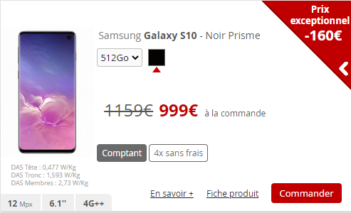 Samsung S10 512Go : Le tarif passe de 1159€ à 999€ soit une remise de 160€. Cette réduction est également valable sur le paiement en plusieurs fois sans frais : en 4 fois 105€ puis 166€ durant 3 mois.