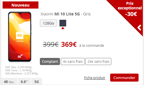 Xiaomi Mi 10 Lite : Le tarif passe de 399€ à 369€ soit une remise de 30€. Cette réduction est également valable sur le paiement en plusieurs fois sans frais : en 4 fois :93€ puis 92€ durant 3 mois ou en 24 mensualités :177€ puis 8€ durant 24 mois