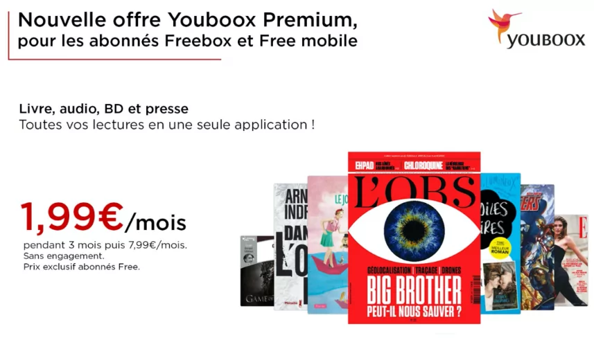 Youboox, l’application de lecture en ligne, a été incluse gratuitement pendant plus d’un an dans les offres Freebox et Free Mobile. En cette période estivale, Free envoie actuellement un mail à ses abonnés afin de leur rappeler qu’elle est désormais disponible en option.