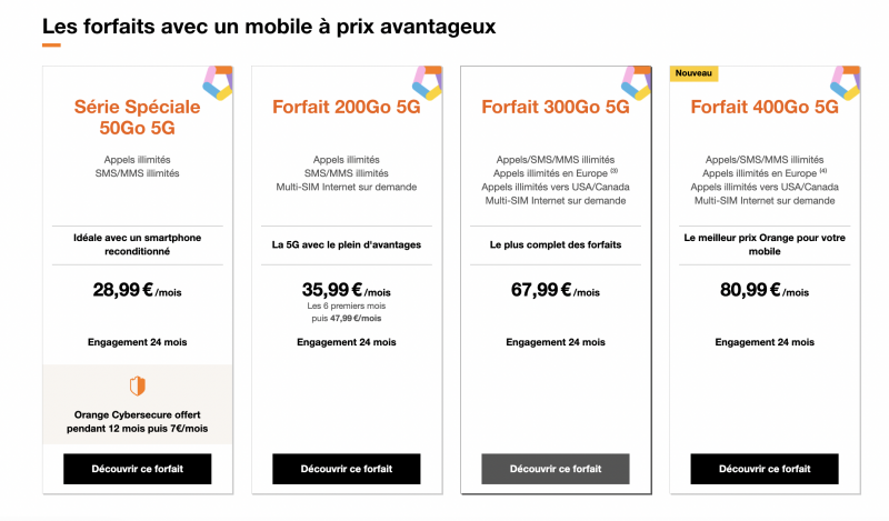 Orange propose également avec mobile à prix avantageux incluant 200 et 300 Go à 35,99€/mois pendant 6 mois puis 47,99€/mois pour le premier et à 67,99€/mois pour le second. S’agissant des forfaits seuls, sont proposées par exemple une offre 120 Go à 24,99€/mois ou encore 170 Go à 22,99€/mois pendant 6 mois puis 34,99€/mois.