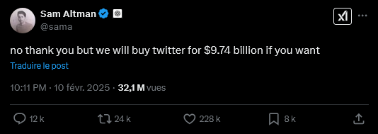 97.4 milliards d’euros pour ChatGPT. L’offre spectaculaire d’Elon Musk pour racheter OpenAI, la société à l’origine de ChatGPT, alimente les débats alors que Paris accueille un sommet sur l’intelligence artificielle sous l’égide d’Emmanuel Macron. Révélée par le Wall Street Journal le 10 février, cette proposition pourrait redessiner l’avenir du secteur. Sam Altman, patron d’OpenAI et rival assumé de Musk, a sèchement rejeté l’offre sur X en lançant une pique cinglante : « Non merci, mais nous voulons bien racheter Twitter pour 9,74 milliards si vous voulez. » Une allusion à la perte de valeur du réseau social depuis son acquisition par Musk en 2022 pour 54 milliards de dollars. Ce dernier n’a pas tardé à répliquer en traitant Altman d’« escroc », illustrant une rivalité de longue date entre les deux entrepreneurs.