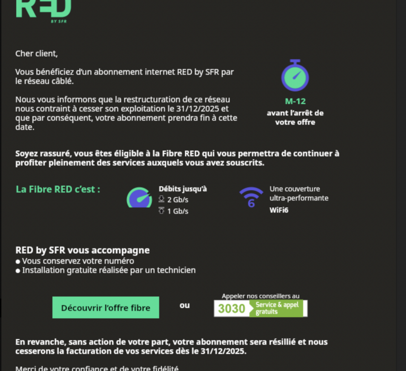 Des abonnés FTTB de SFR sont prévenus, l’opérateur cessera l’exploitation de son réseau fin 2025.