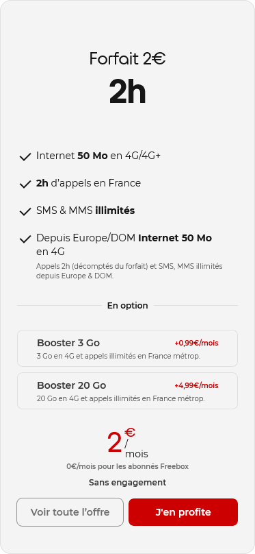 Au total, le forfait coûtera donc 6.99€/mois pour 20 Go en 4G avec des frais d’activations toujours à 10€. Les abonnés Freebox peuvent quant à eux profiter d’un forfait 2€ avec booster 20 Go à 4,99/mois grâce à leur avantage (forfait à 0€). Les abonnés actuels au booster 20 Go ne sont pas concernés par cette baisse de prix. S’agissant du forfait 2€ seul, l’ex-trublion n’augmentera jamais son prix, Xavier Niel en a fait la promesse l’année dernière.