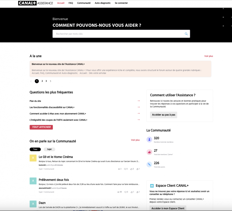 Pour offrir une expérience plus complète, Canal+ a structuré le forum autour de quatre grandes rubriques : Accueil, FAQ, Communauté et Auto-diagnostic”, La première dite “Accueil”, informe des dernières actualités et alertes importantes, mises en avant pour faciliter les démarches. “Vous y trouverez également des accès rapides vers l’espace client, votre profil, et d’autres liens utiles. Cette rubrique vous permet de rester informé et de gérer facilement votre abonnement”, explique l’assistance.