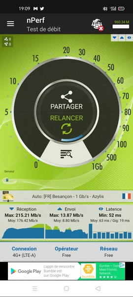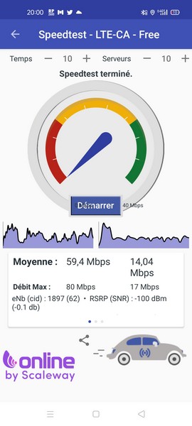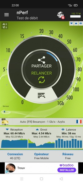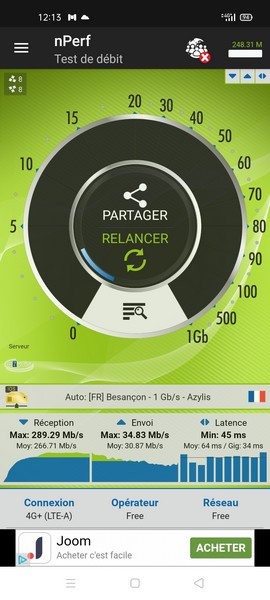 Ci-dessous, un exemple de débit en intérieur, avec une carte SIM Free Mobile :