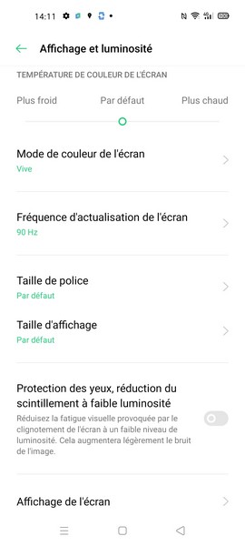 Durant notre semaine d’utilisation, rien de spécial à signaler concernant l’écran qui propose de belles couleurs, une bonne fluidité dans les jeux et la navigation et une bonne luminosité pour l’usage en extérieur. Le poinçon pour le capteur photo frontal ? Il se fait rapidement oublier du fait de sa localisation et sa taille. Notez enfin que différents réglages sont disponibles comme la température des couleurs (froid, défaut ou chaud) ou le taux de rafraîchissement (automatique, 60 Hz ou 90 Hz).