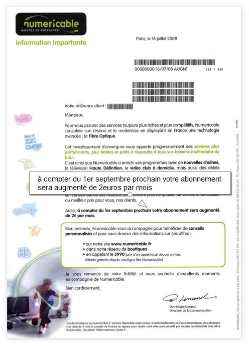 Courrier reçu par les abonnés Numéricable :