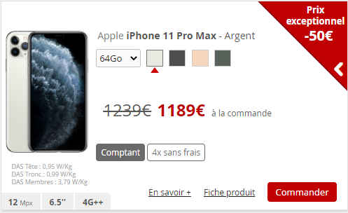 L’iPhone 11 Pro Max 64Go est proposé à 1189€ au lieu de 1649€ soit une remise de 50€. Celle-ci est valable également sur le paiement en 4 fois sans frais 691€ à la commande puis 166€ durant 3 mois.