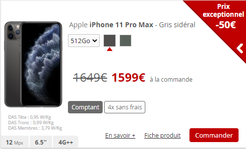L’iPhone 11 Pro Max 512Go est proposé à 1599€ au lieu de 1649€ soit une remise de 50€. Celle-ci est valable également sur le paiement en 4 fois sans frais 1101€ à la commande puis 166€ durant 3 mois.