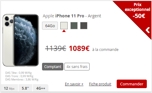 L’iPhone 11 Pro 64Go est proposé à 1089€ au lieu de 1139€ soit une remise de 50€. Celle-ci est valable également sur le paiement en 4 fois sans frais 591€ à la commande puis 166€ durant 3 mois.