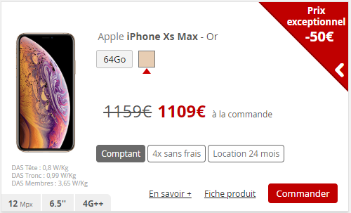 L’iPhone XS 64Go est proposé à 1109€ au lieu de 1159€ soit une remise de 50€. Celle-ci est valable également sur le paiement en 4 fois sans frais 611€ à la commande puis 166€ durant 3 mois.