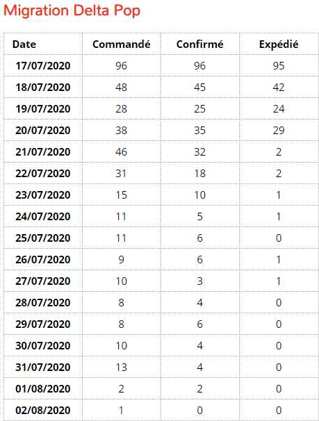 Pour ceux qui attendant le Freebox Delta Pop, freebox.toosurtoo, permet d’avoir une idée du temps qu’il faut attendre avant de recevoir son précieux. Comme on peut le constater sur la tableau ci-dessous, seules les commandes effectuées avant le 20 juillet ont été satisfaites. Les autres devront donc attendre que Free refasse ses stocks de Server Delta (puisque c’est le manque de ce matériel qui semble être à l’origine des retards)