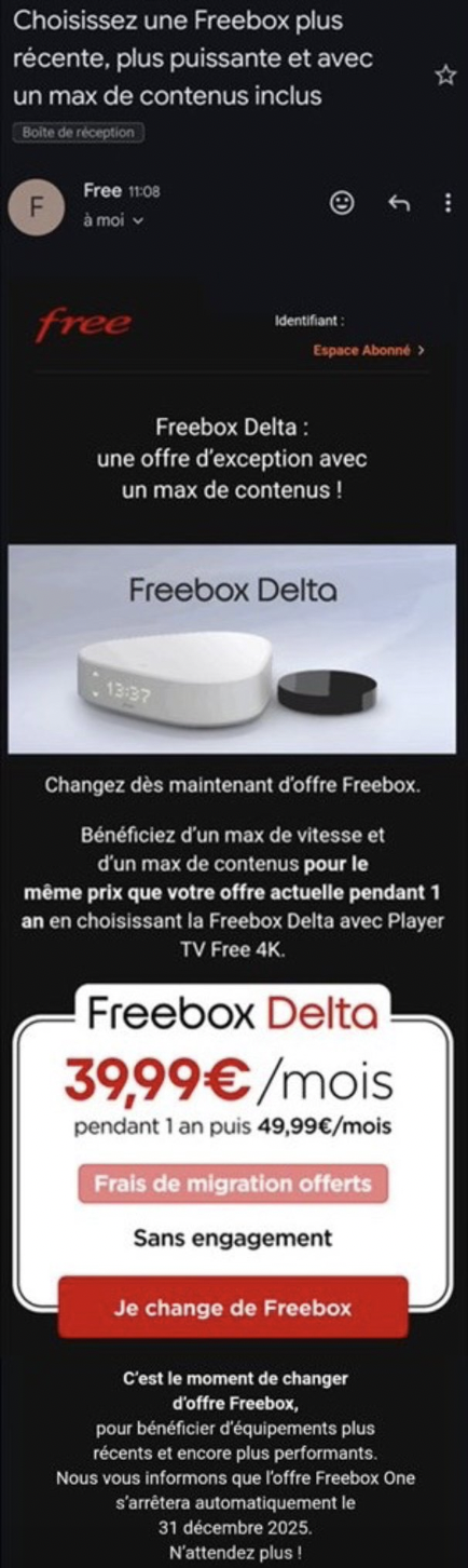 Pour faciliter leur transition vers une autre offre Freebox, Free offre les frais de migration aux abonnés Freebox One vers sa Freebox Pop proposée au même prix ainsi que vers sa Freebox Ultra et Delta. Pour ceux qui souhaiteraient d’ailleurs migrer vers la première box haut de gamme de Free lancée en 2018, le FAI propose une promotion la première année soit un tarif de 39,99€/mois pendant 12 mois puis 49,99€/mois, sans engagement. Les abonnés profiteront alors de Netflix, Amazon Prime (Prime Video), Universal+ et Cafeyn inclus, au même prix que leur abonnement actuel pendant 1 an avant de payer 10€ de plus.