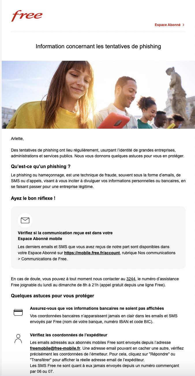Dans un nouveau courriel, Free Mobile rappelle à ses abonnés l’importance d’adopter des réflexes de vigilance face aux tentatives de phishing.
