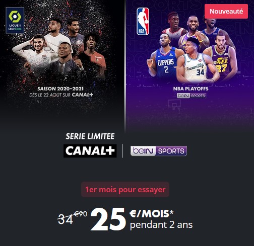 L’offre Canal+ / beIN SPORTS revient à 25 euros par mois, au lieu de 34,90 euros, avec un engagement de deux ans. Celle-ci est également proposée en 100 % Digital (ordinateur, smartphone, tablette, etc.) sans engagement à 30 euros par mois au lieu de 34,90 euros ou à 15 euros par mois au lieu de 24,95 euros pour les moins de 26 ans.