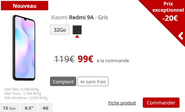 Le second est le Redmi 9A, qui est d’ailleurs proposé à 99 euros au lieu de 119 euros en ce moment. On peut envisager un paiement en 4x sans frais (27 euros à la commande, puis 3 fois 24 euros).