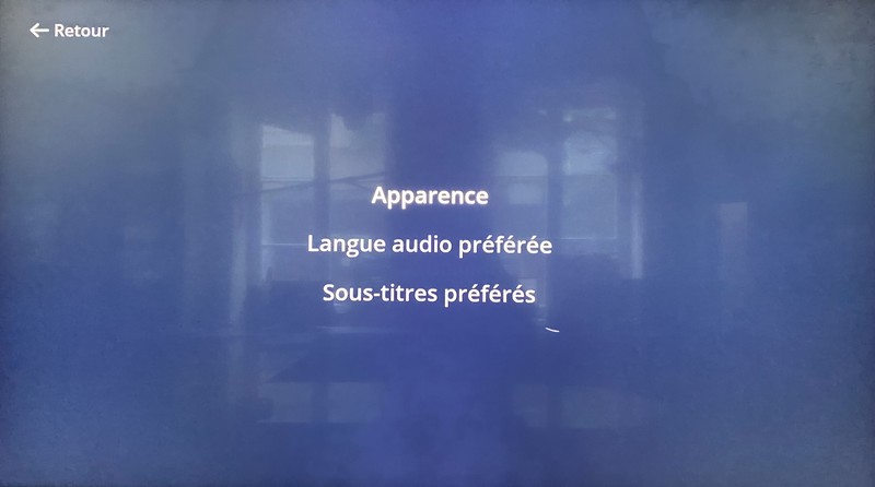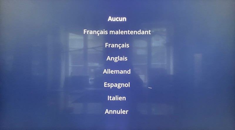 Le troisième, “Sous-titres préférés”, permet de gérer le sous-titrage. Là encore, on a les langues suivantes : Allemand, Anglais, Espagnol, Français ou Italien. Il y a aussi une option “Français malentendant”. On peut évidemment désactiver la fonction.