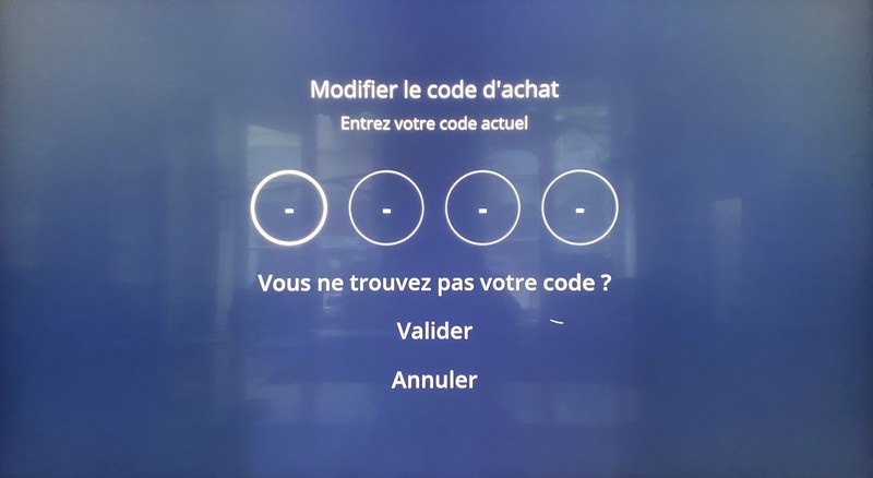 Le code d’achat peut quant à lui être modifié directement depuis l’interface TV, à condition de connaître le sésame actuel. Après saisie de votre code, il vous restera à saisir le nouveau et à valider.