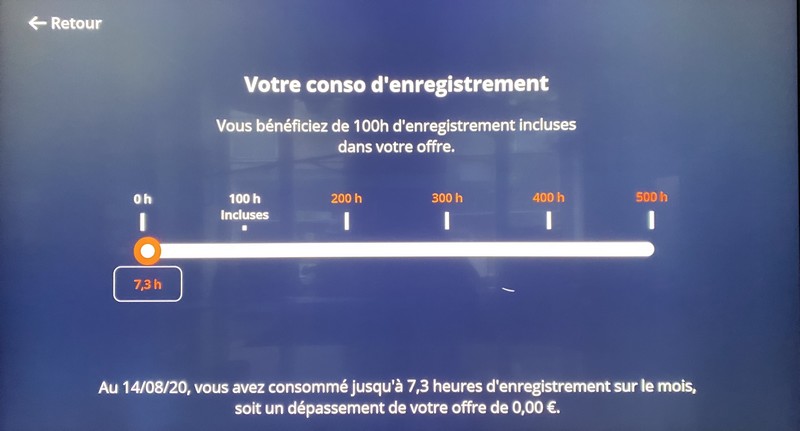 “Votre conso d’enregistrement” renvoie de son côté vers une frise indiquant la consommation d’enregistrement TV dans le mois. Rappelons d’ailleurs que 100 heures sont incluses. L’heure supplémentaire est facturée 0,02 euro.