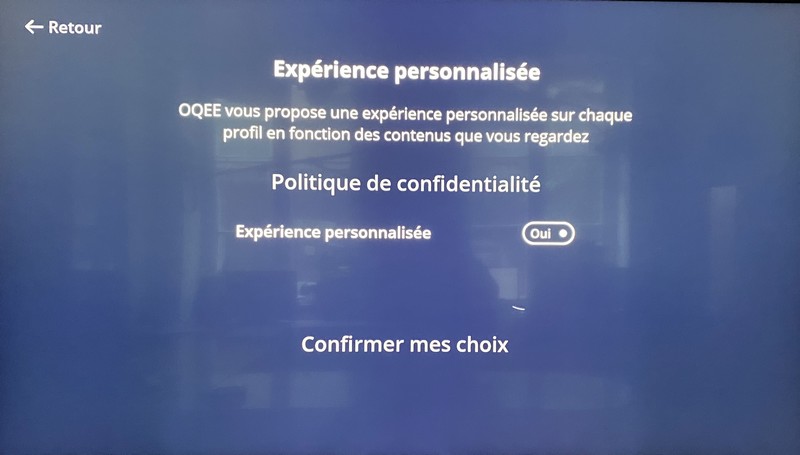 L’interface OQee peut analyser les contenus que vous consultez pour affiner les recommandations de contenus. Il est possible de désactiver cette fonction en basculant le curseur en bas de l’écran dans la partie “Expérience personnalisée”.