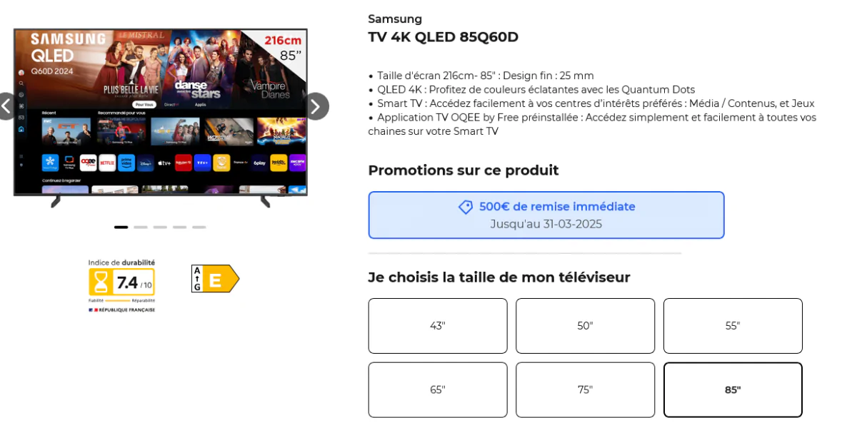 Les abonnés Freebox disposent d’un magasin dédié dans leur espace client pour acquérir un nouveau téléviseur connecté Samsung et le payer sur trente mois. Régulièrement, des offres promotionnelles sont proposées et depuis peu, une remise exceptionnelle est affichée pour l’achat d’un téléviseur QLED Q60D de 85 pouces.