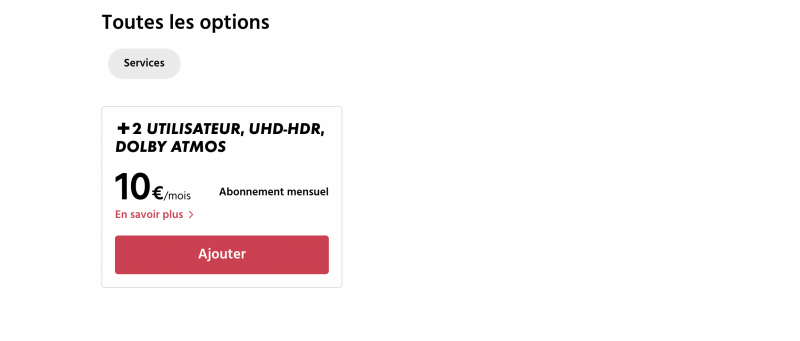 Pour ceux qui sont concernés, comme par exemple les abonnés Freebox Ultra, Canal+ commercialise à présent deux options afin de leur faire profiter de la 4K UHD et du Dolby Atmos, celles-ci sont proposées “en fonction de la formule d’abonnement détenue”, précise le groupe audiovisuel. La première intègre 1 utilisateur simultané supplémentaire UHD-HDR Dolby Atmos à 5€/mois alors que la seconde porte à deux le nombre d’utilisateurs simultanés, cette fois à un tarif de 10€/mois. Dans le cas d’un abonnement Freebox Ultra avec Canal+ La Chaîne en Live incluse, seule l’option 2 semble pour l’heure proposé sur l’Espace Client Canal+ dans la rubrique “Ajouter des options”.