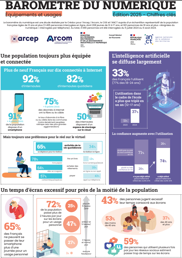 L’ARCEP vient de publier son baromètre du numérique, qui permet en 1 minute de connaitre les usages des Français en 2025. Quelle est la part de Français connectée à Internet ? Quel est le temps passé devant les écrans ? Combien sommes nous à utiliser l’IA ? La réponse à ces réponses et à bien d’autres en une infographie :