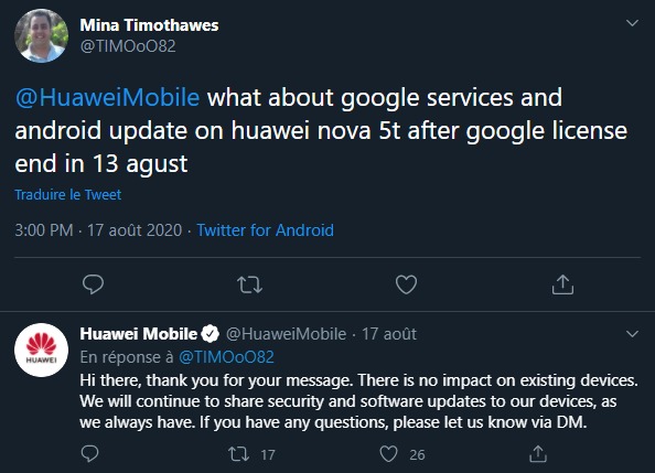 De plus, un internaute a posé une question sur le compte officiel Twitter @HuaweiMobile, afin de savoir quel impact aura la perte de cette licence pour Huawei sur ses terminaux déjà existants compatibles avec Android.