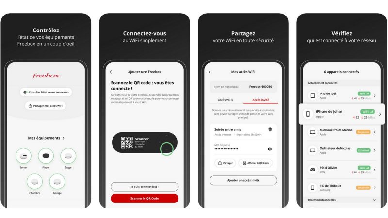 Disponible sur Android et iOS, l’application Freebox Connect a été dévoilée en juillet dernier, en même temps que la Freebox Pop. Elle permet de surveiller les appareils connectés et leurs consommations, de définir des profils familiaux pour contrôler le temps d’écran des enfants, de planifier le fonctionnement le Wi-Fi à la maison (éteindre durant le travail ou les vacances), de gérer le filtrage Mac et de faciliter le partage de la connexion Wi-Fi grâce à un QR Code.
