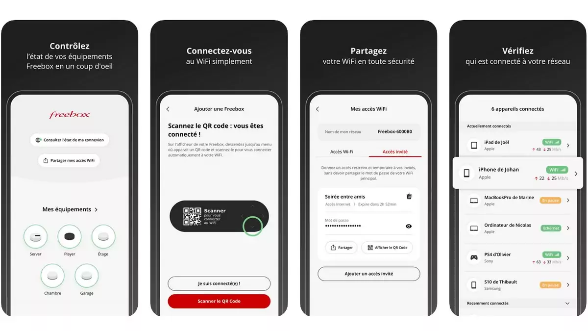 Disponible sur Android et iOS, l’application Freebox Connect a été dévoilée en juillet dernier, en même temps que la Freebox Pop. Elle permet de surveiller les appareils connectés et leurs consommations, de définir des profils familiaux pour contrôler le temps d’écran des enfants, de planifier le fonctionnement le Wi-Fi à la maison (éteindre durant le travail ou les vacances), de gérer le filtrage Mac et de faciliter le partage de la connexion Wi-Fi grâce à un QR Code.