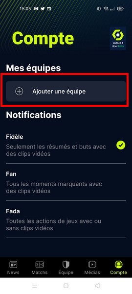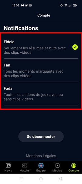 Viendra ensuite la possibilité de définir le mode de notifications. Trois modes existent selon les contenus souhaités : “Fidèle” (seulement les résumés et buts avec des clips vidéo), “Fan” (tous les moments marquants avec des clips vidéo) et “Fada” (toutes les actions de jeu avec ou sans clip vidéo).