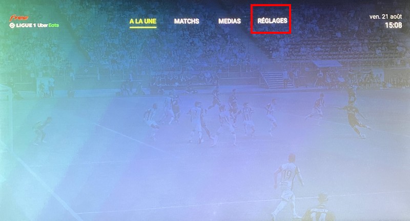 Dans l’interface TV sur Freebox Pop ou Freebox mini 4K, la démarche est similaire. À partir de la page d’accueil de l’application Free Ligue 1 Uber Eats, allez vers le haut puis vers la droite, pour vous rendre dans la section “Réglages”.