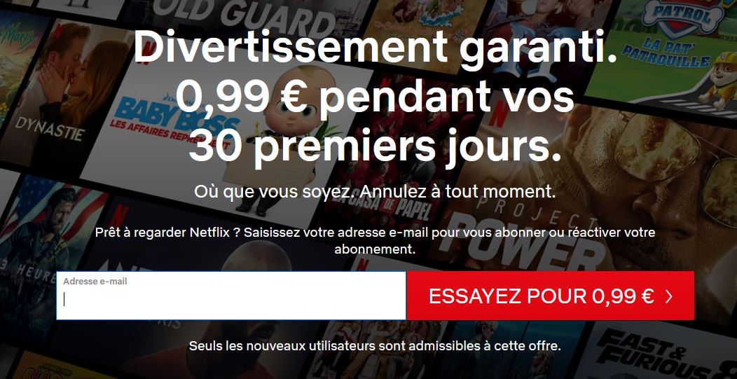 Le service de SVOD testes de nombreuses formules depuis le début de l’année pour permettre aux internautes de découvrir sa plateforme. Après un retour au mois gratuit, cette fois Netflix propose 30 jours d’essai à 0.99€/mois.