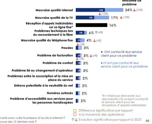 Viennent ensuite la réception d’appels indésirable sur la ligne fixe (16%), les problèmes techniques de raccordement (6%, en hausse), puis divers soucis plus rares comme les problèmes de facturation, de contrat, de fraude, qui restent minoritaires.