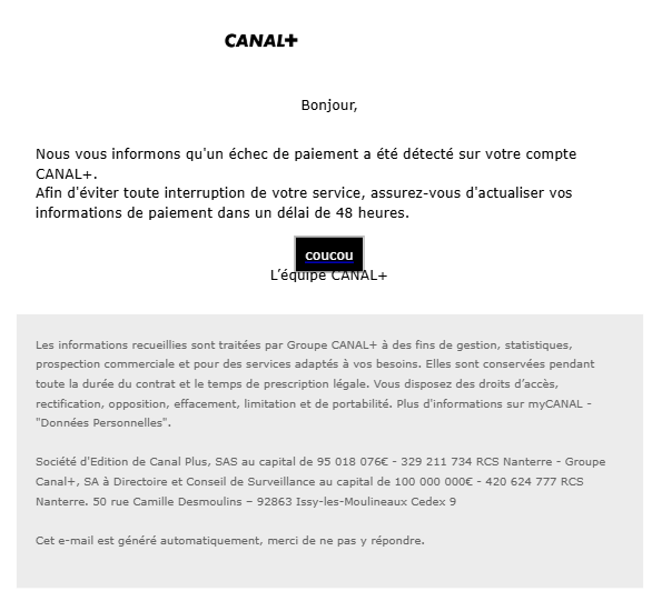 Canal+ est en ce moment victime d’une telle usurpation d’identité et tire la sonnette d’alarme sur son site web pour les informer d’un faux-mail circulant. Ce dernier a pour intitulé “Votre compte pourrait être suspendu sans intervention de votre part”, et fait mention d’un échec de paiement détecté sur le compte de l’abonné. Il presse ainsi l’utilisateur à “actualiser ses informations de paiement dans un délai de 48 heures“.