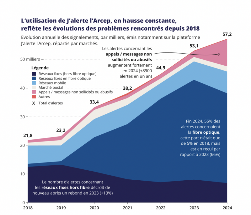 La fibre concentre désormais la majorité des signalements (55 %), alors qu’elle ne représentait que 5 % en 2018. Ce basculement illustre à la fois la montée en puissance de la technologie et les défis persistants liés à sa généralisation. Par ailleurs, les alertes liées aux appels et messages non sollicités explosent (+8 900 en un an), témoignant d’une recrudescence de démarchages abusifs et d’usurpations de numéros.