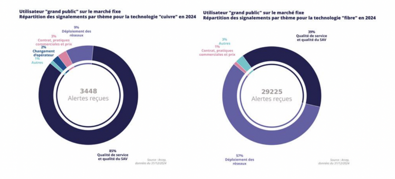 La grande nouveauté du bilan 2024 réside dans la hiérarchie des plaintes : pour la première fois, les problèmes liés au déploiement des réseaux deviennent la principale source d’alerte, supplantant les critiques sur le service après-vente. Sur les réseaux cuivre, la qualité de service reste la principale source d’insatisfaction (85 % des signalements), tandis que sur la fibre, c’est désormais le déploiement (57 %) qui concentre les réclamations, devant la qualité de service (39 %). Ces données confirment un glissement des préoccupations vers l’amont de la chaîne de connectivité, notamment en ce qui concerne la couverture effective des territoires.