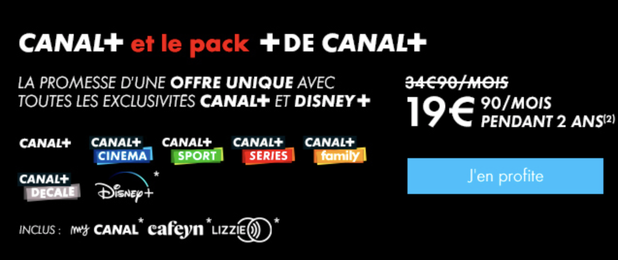 La seconde offre peut attirer certains gros consommateurs de contenus. Elle comprend l’abonnement simple à Canal+ et le pack “+ de Canal+” à savoir toutes les chaînes et exclusivités du groupe et le service SVoD Disney+. Sans oublier, myCanal, Cafeyn et Lizzie. Le tout pour 19,90€/mois pendant 24 mois au lieu de 34,90€/mois.