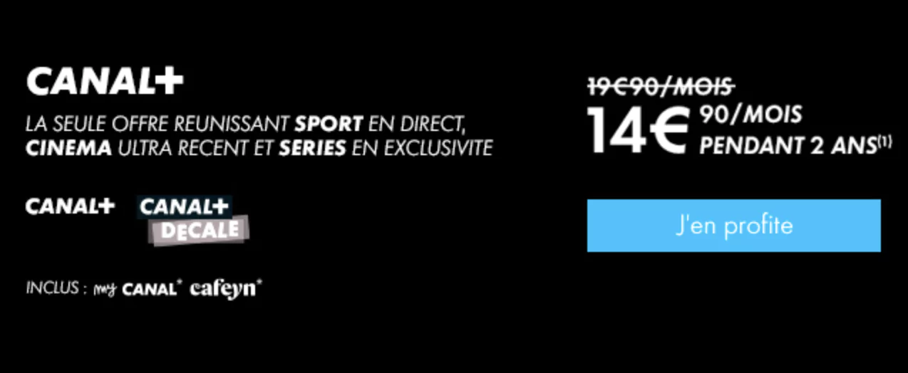 Le premier abonnement spécial n’est autre que le basique, comprenant les chaînes Canal+ et Canal+ Décalé avec myCanal et Cafeyn inclus, le tout pour 14,90€/mois pendant 2 ans au lieu de 19,90€/mois.