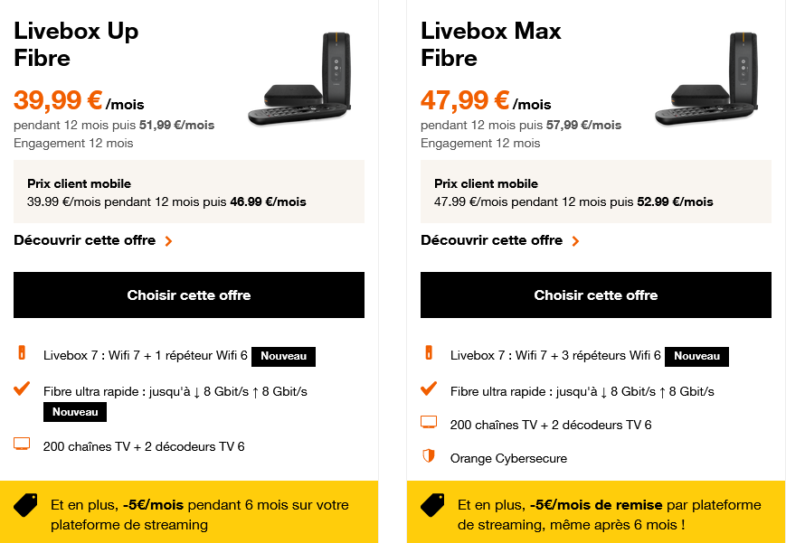 La Livebox Max est la seule qui voit son tarif augmenter, passant de 39.99€/mois durant six mois puis 57.99€/mois à 47.99€ pendant 12 mois puis 52.99€/mois. Si elle gagne le WiFi 7 avec son nouveau Server, ses débits restent à 8 Gbit/s symétriques donc. La encore, deux décodeurs TV 6 sont proposés. Les plus grosses différences par rapport à la Livebox Up sont la disponibilité de trois répéteurs WiFi 6 au lieu d’un, l’intégration du service Orange Cybersecure et des réductions permanentes de 5€ sur plusieurs services de streaming.